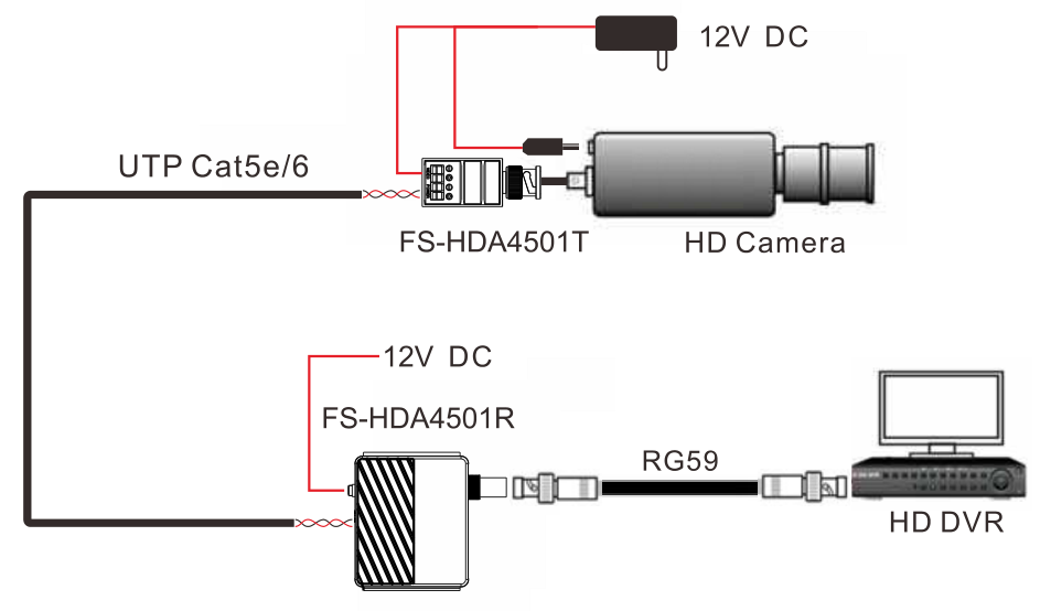 The FS-HDA4501R video balun is an active (amplified) device that allows the transmission of real-time CCTV HD video signal via cost-effective Unshielded Twisted Paired (UTP) cable. The FS-HDA4501R can be used with active transmitter of FS-HDA4501T which is compatible with all HD-TVI, HD-CVI, AHD and CVBS analog cameras. Transmission distance within a certain range can be flexibly adjusted by the dial switch of FS-HDA4501R.
