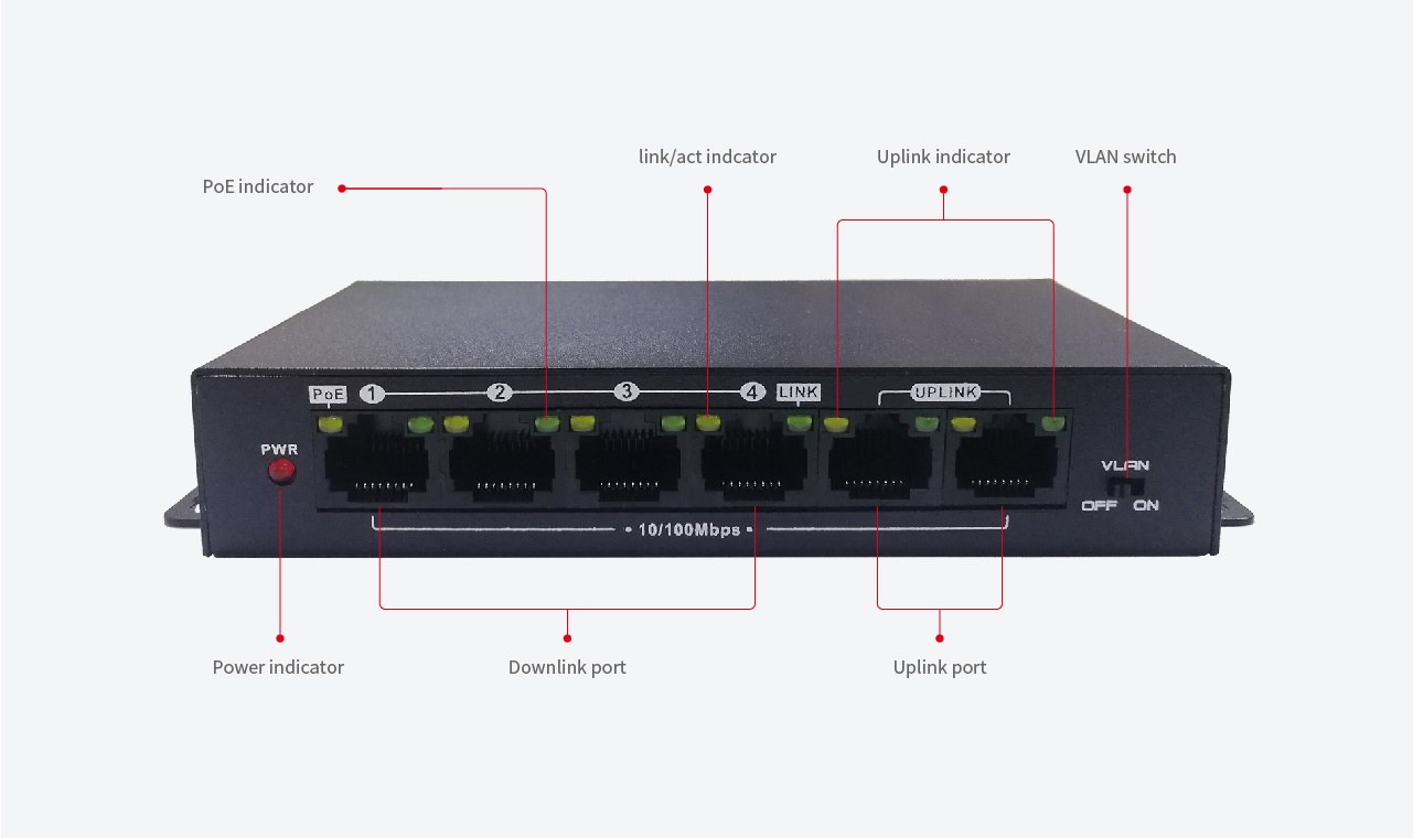 It provides both 802.3af/at PoE functions along with 4 x 10/100Base-TX ports featuring 15.4-watt 802.3af/30-watt 802.3at PoE in RJ-45 interfaces and extra 2 x 10/100Mbps UPLINK RJ-45 ports to keep a cascade connection with another switch or NVR as a kit for the administrators to centrally and efficiently manage the surveillance system in the local LAN and the remote site via Internet.
